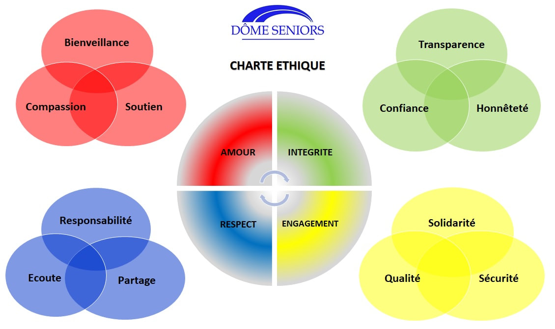 Ces valeurs humaines qui sont au cœur des rapports sociaux, ont abouti à une charte, qui comporte les fondements éthiques de l’association Dôme Seniors. Cette dernière est motivée par une vision de continuité et de sens, dans une approche globale de la personne âgée.